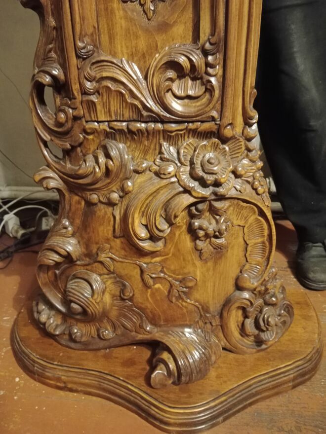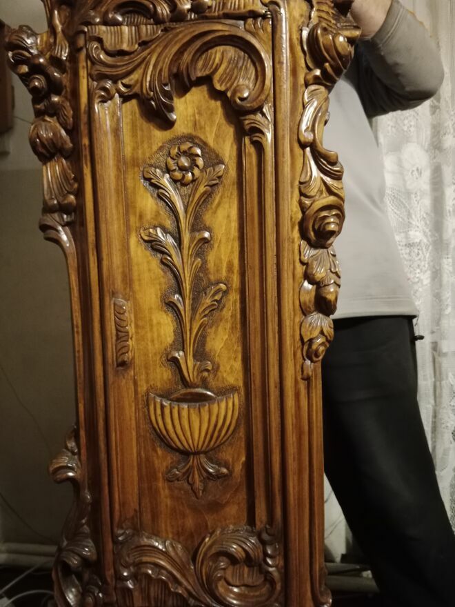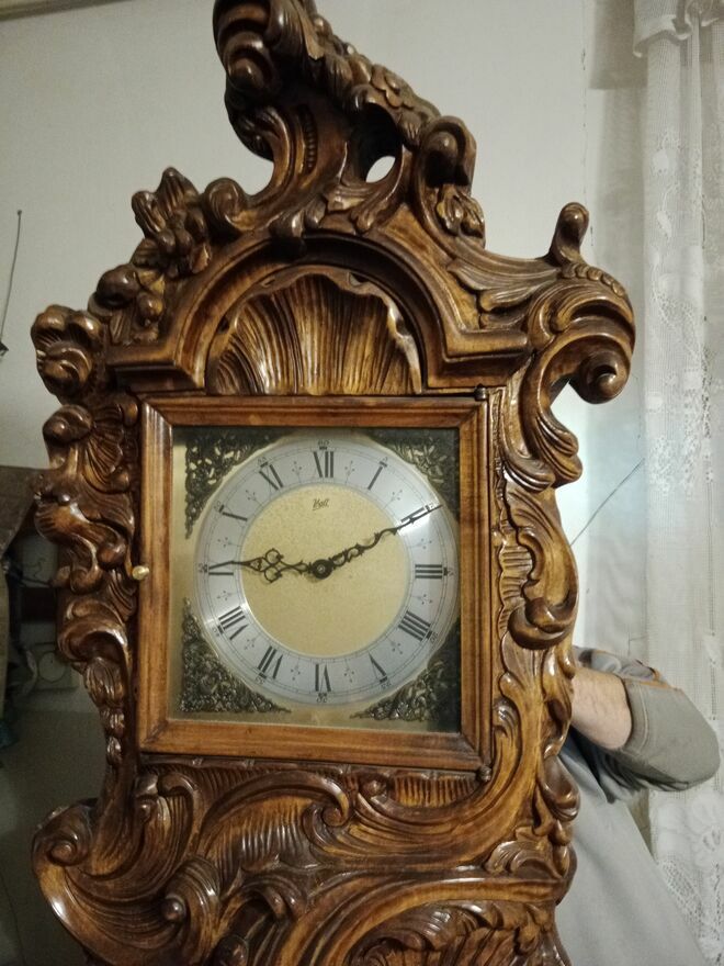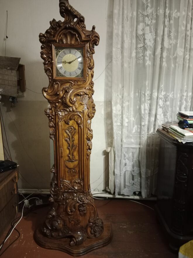 Witam.Mam do sprzedania zegar francuski Neorokokowy podłogowy, kwadransowy. Bogato rzeżbiony w masywie drewna orzechowego. Zegar wybija godziny i kwadranse. Mechanizm sprawny w 100%. Mechanizm łańcuchowy,jest kompletny. Ma trzy oryginalne mociężne ciężarki a także po środku zamocowanę wachadło. Całość zachowana w oryginalny stanie.